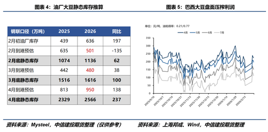 国内方面,连盘豆粕缺乏新增边际驱动,周内受美盘上涨带动偏强运行。根据Mysteel最新数据推算,截至2月底,国内油厂大豆理论静态库存仅较去年同期高出约62万吨,暗示结构性紧缺预期并未完全证伪,连盘豆粕因此不易在短期内出现流畅的单边下跌,仍需关注后续进口大豆到港情况(包含通关政策的变化)以及储备拍卖进展。不过,在总量层面,巴西丰产前景相对明朗;阿根廷虽存在局部减产叙事,但量级相对有限,更偏向阶段性扰动。在南美产量逐步兑现的背景下,即便是短暂的通关延期也难以改变5月前后国内大豆及豆粕供应充裕的事实,连盘豆粕整体难有太多上行空间。此外,当前巴西大豆对盘压榨利润仍较丰厚,短期若盘面冲高或再度给出沽空机会。